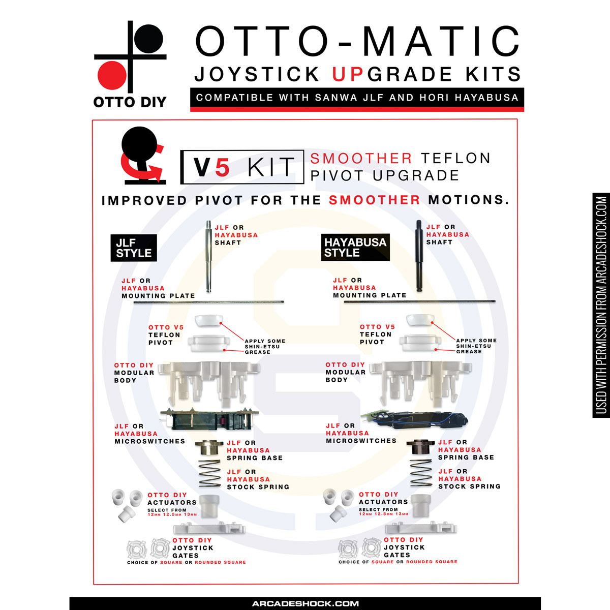 The Sanwa JLF-TP-8YT Joystick is long considered the FGC standard among joystick levers, and has enjoyed its lions share of performance mods and accessories over the years. OTTO DIY introduces a comprehensive kit whose goal is to enhance control through its use of unique materials and modular pieces that replace the existing parts of your JLF-TP, TP-SK or Hori Hayabusa Joystick.