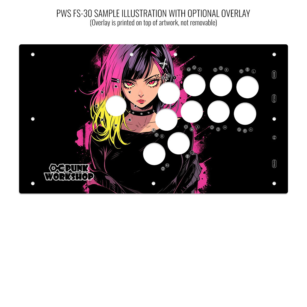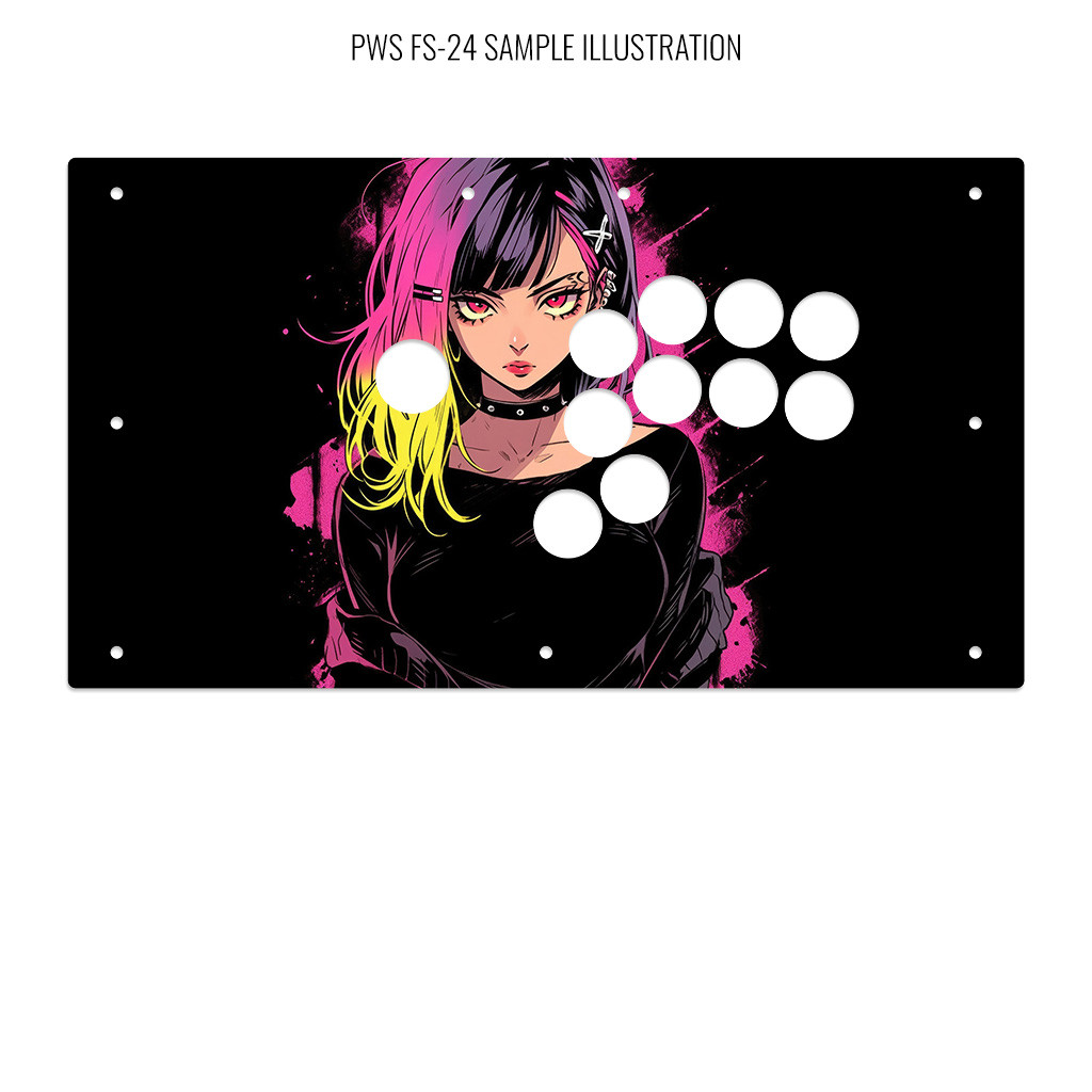 The Punk Workshop "FS" series is a full sized model with similar dimensions as a conventional fightstick, and sports a traditional joystick lever. Two configurations - FS-24 and FS-30 - are currently avaiable for this model. Choose the artwork cut which fits the configuration you currently own. If you're not sure, it's best to check with the PWS store you bought your model from.
