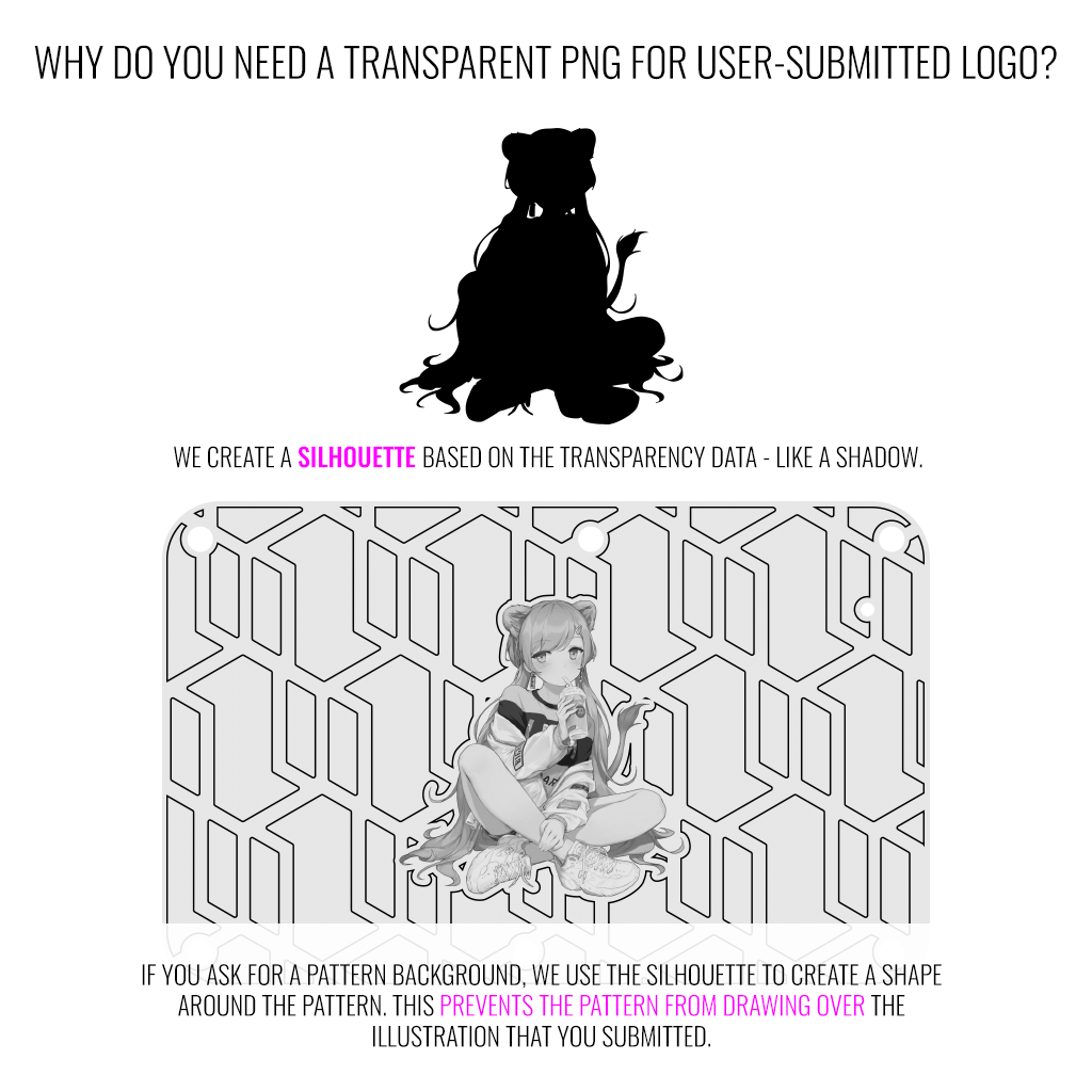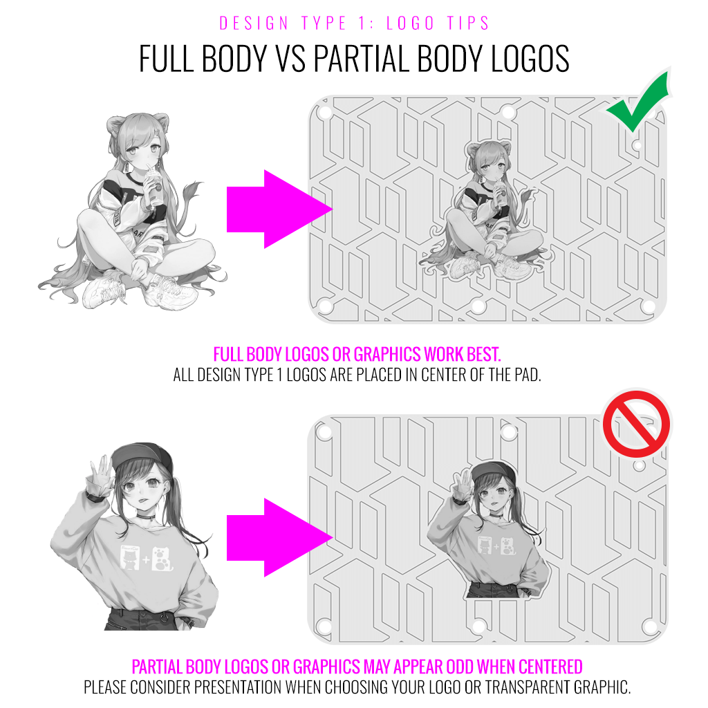 Customer provides transparent PNG logo or graphic (etched center, 50-75% of pad area).