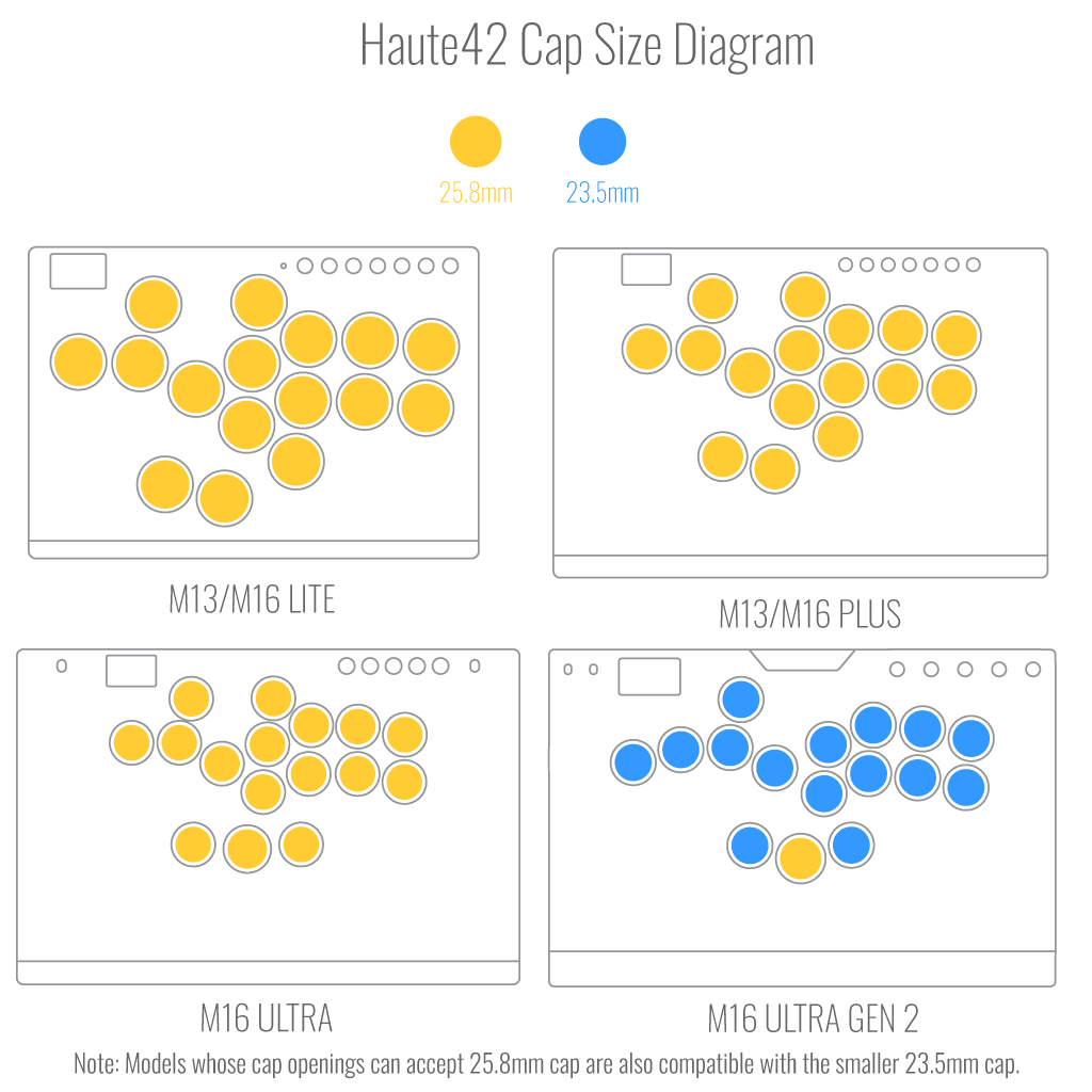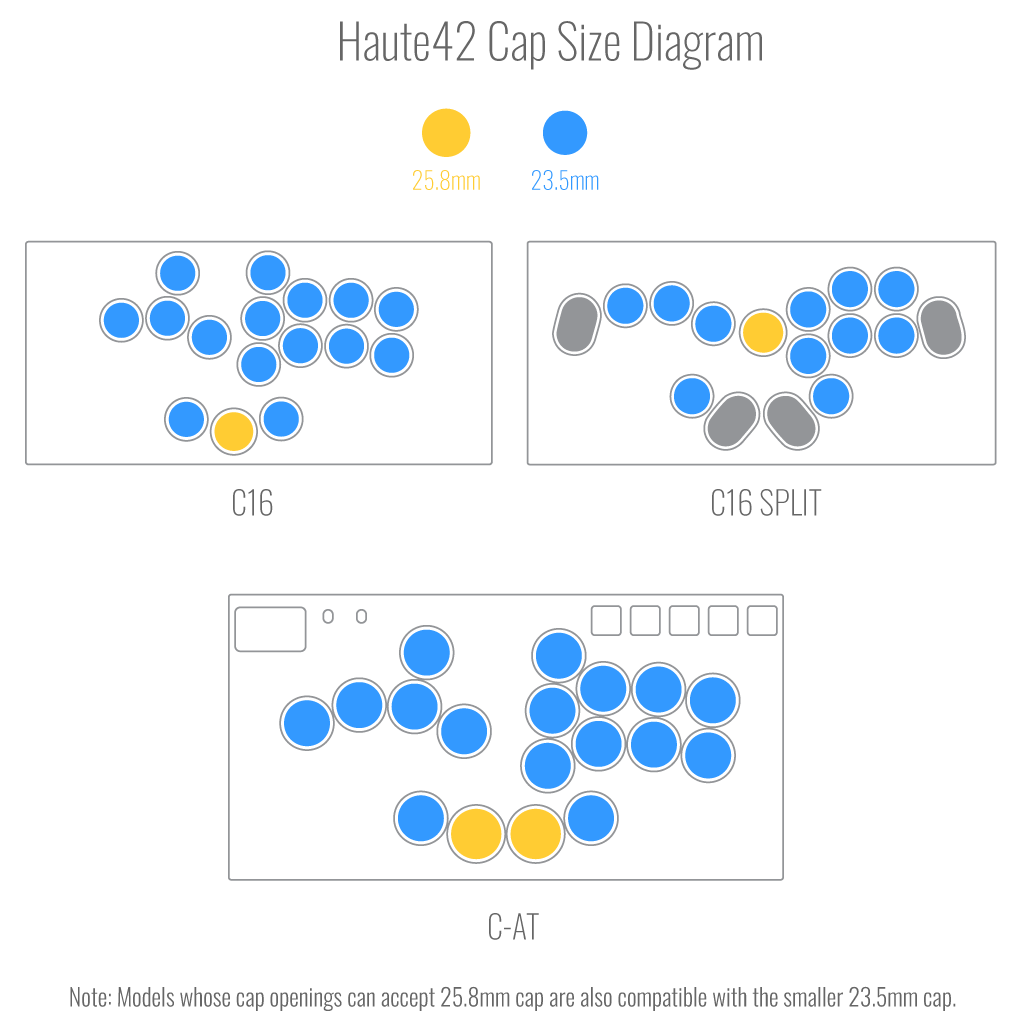 Please note that the 23.5mm and 25.8mm key caps are incompatible with the following Haute42 models, due to their use of a thicker rim attachment on each button hole:
