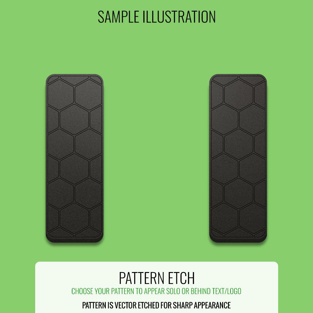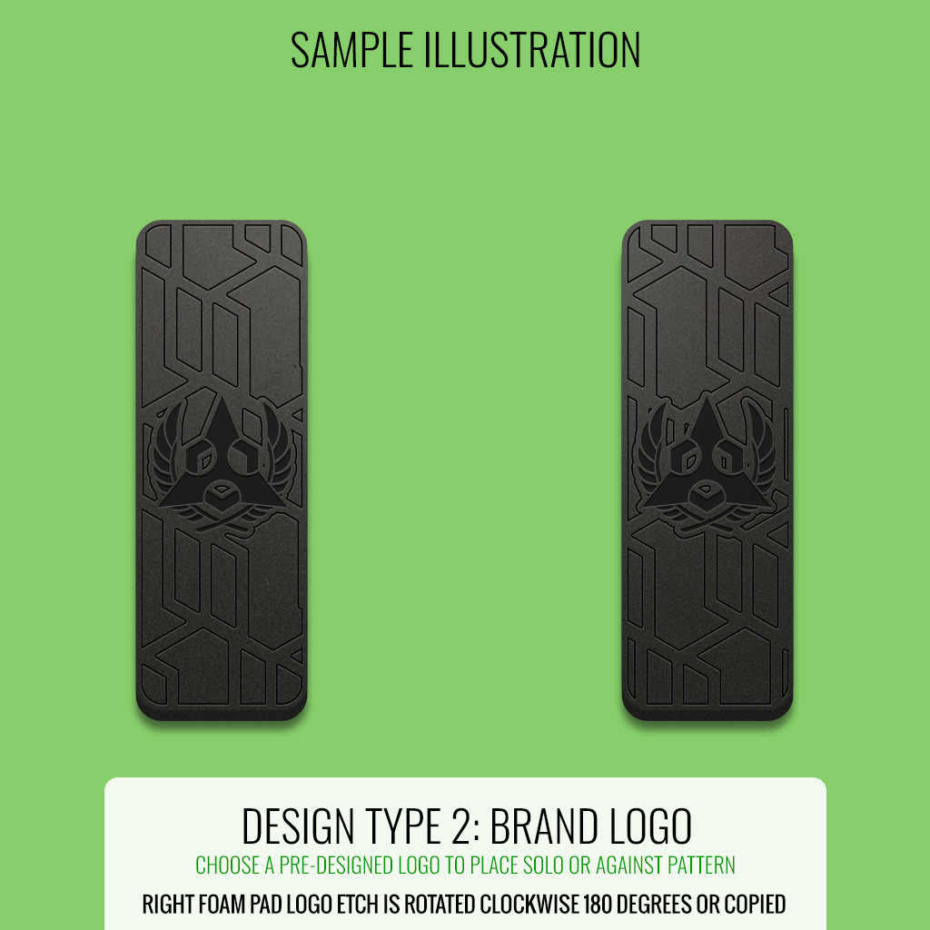 Choice of pre-designed logo (etched center, 50-75% of pad area). | Customer provides illustration to etch onto the entire pad, or across two split pads where applicable. |