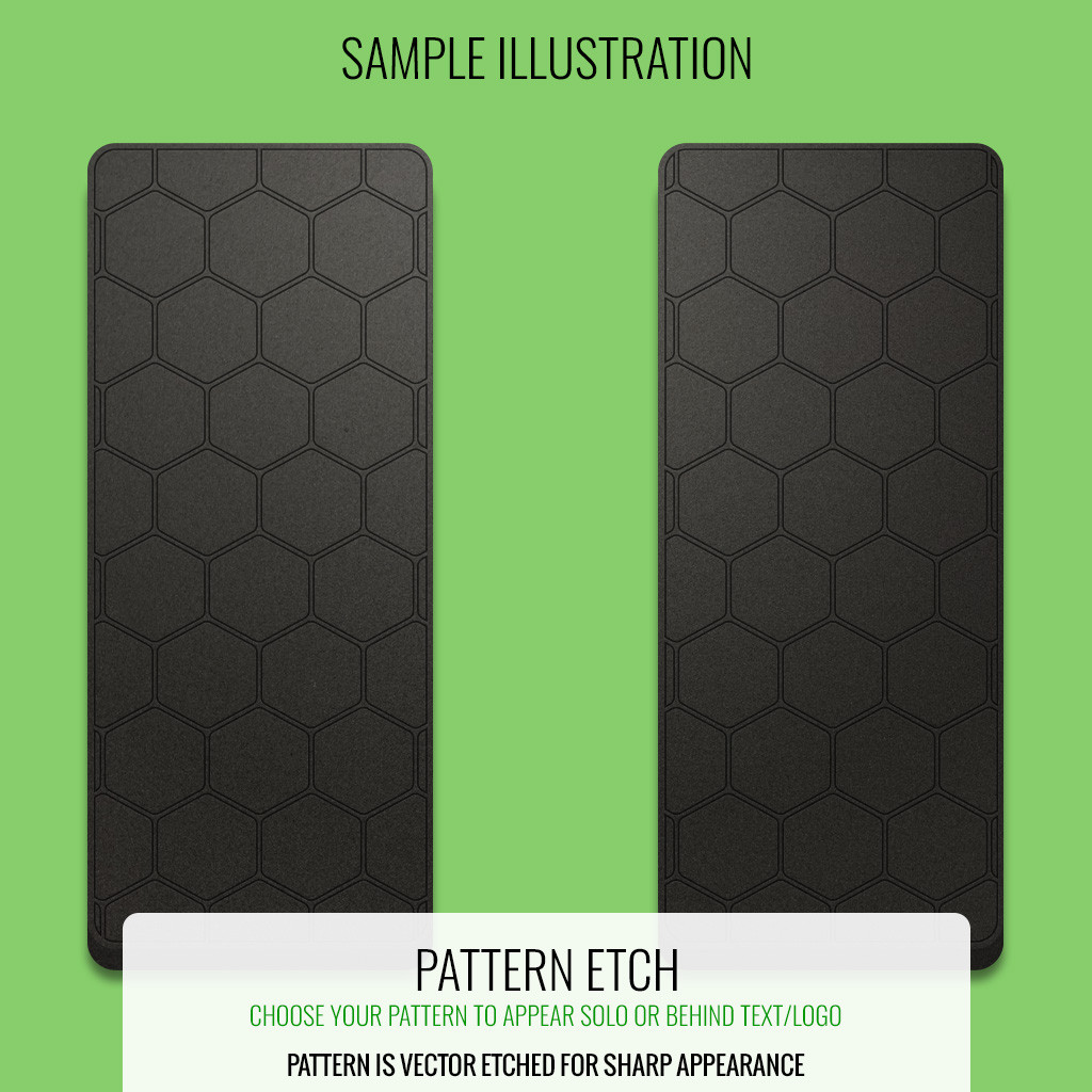 Choice of pre-designed logo (etched center, 50-75% of pad area). | Customer provides illustration to etch onto the entire pad, or across two split pads where applicable. |